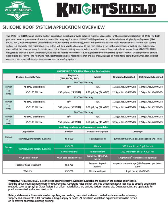 Explore literature that helps support specification, application, and overall system understanding for the KNIGHTSHIELD silicone roof coating line.