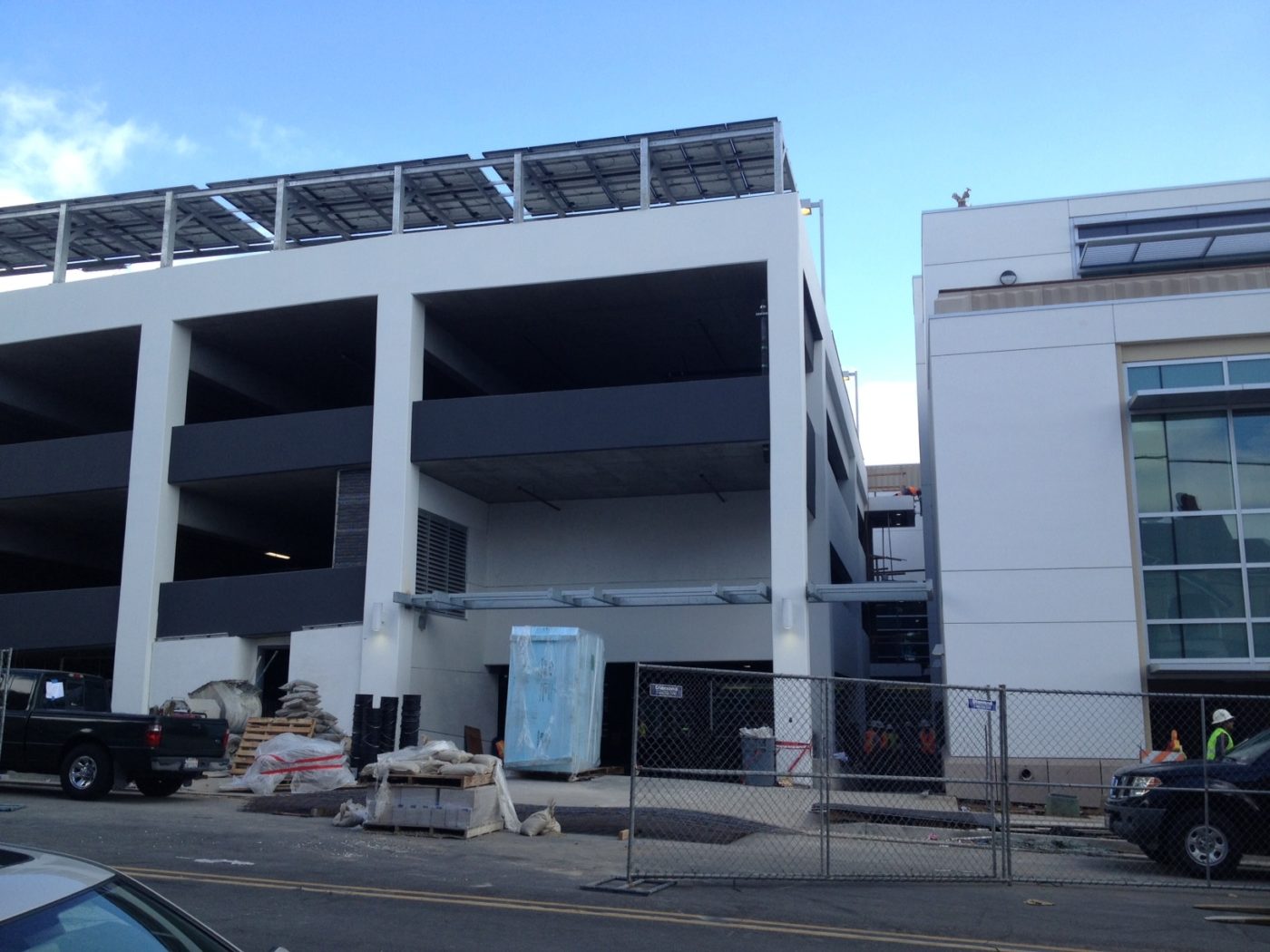 This is a concrete waterproofing system for split-slab application under the main parking entrance and sidewalks, planter boxes, two elevated decks, and ramps. MEL-ROL was used over the foam forming for sloped ramp as a secondary waterproofing membrane. REZI-WELD 3/2 was used around drain collar. This project shows the need for protection of the waterproofing membrane.